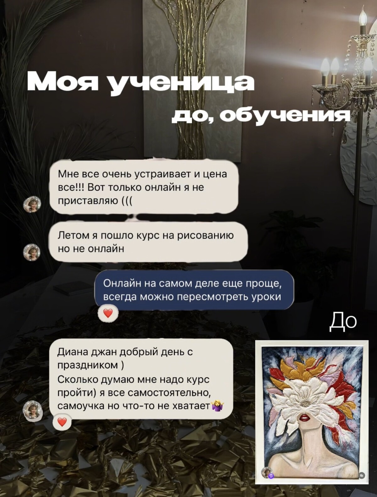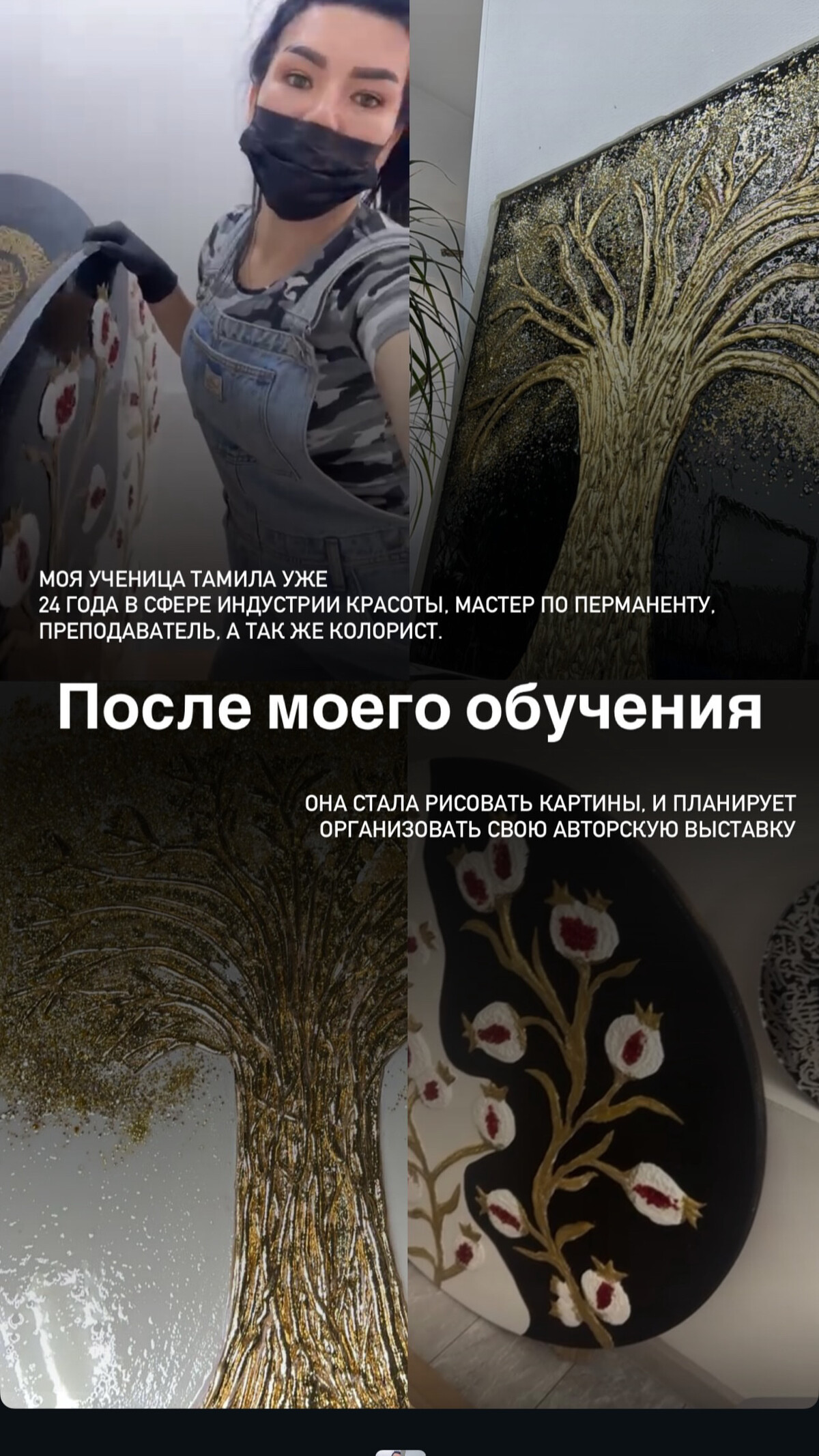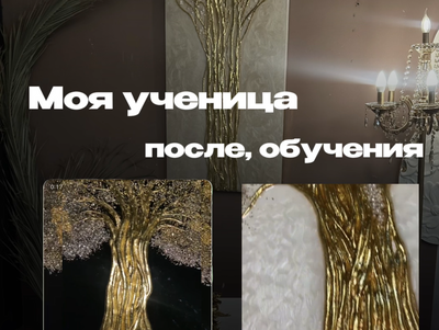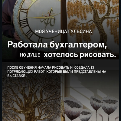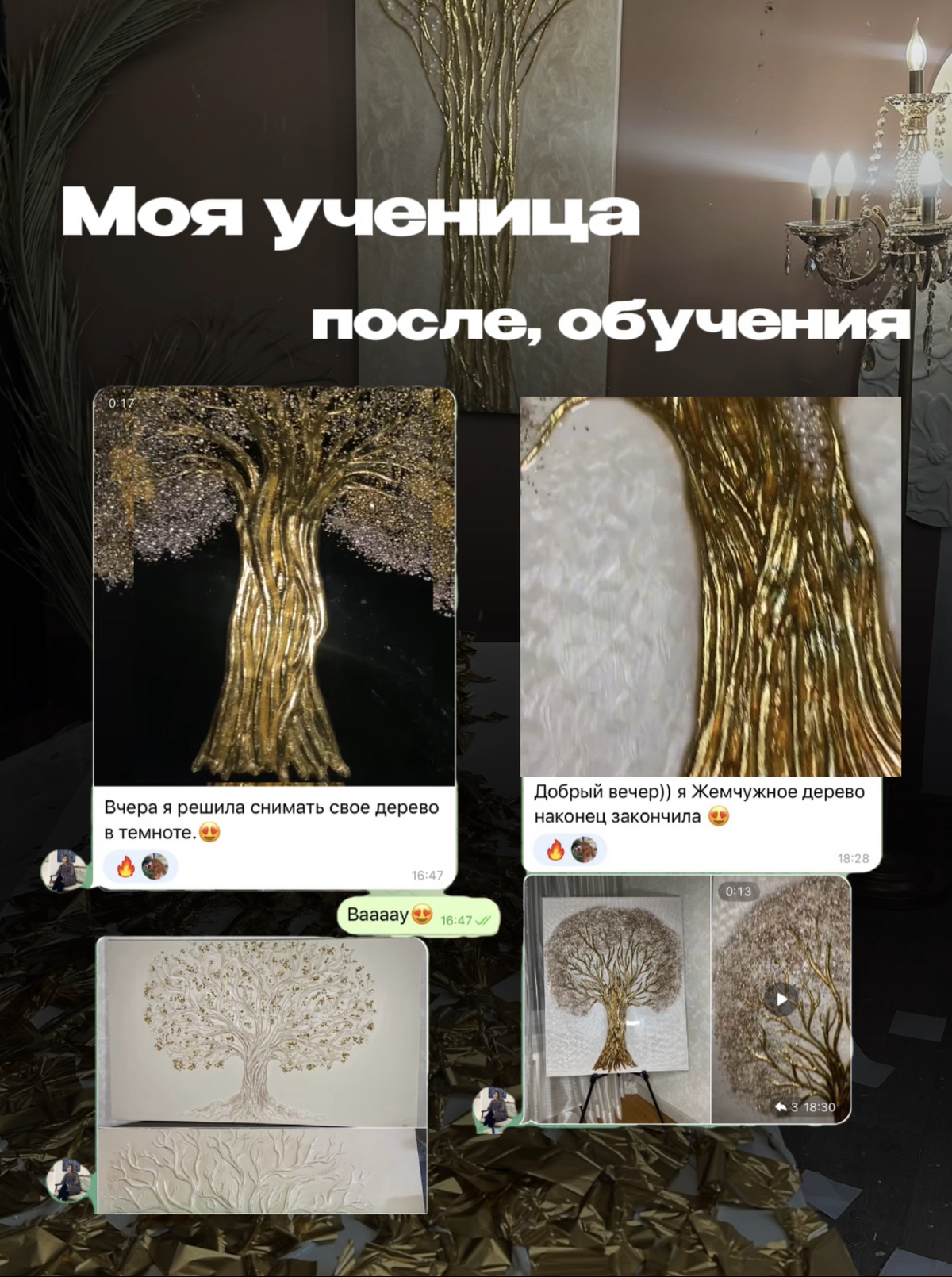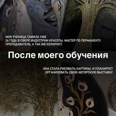 - Работать с различными стилями и техниками, включая сложные 3D картины, масло, акрил, смола, стеклянные элементы, поталь.
